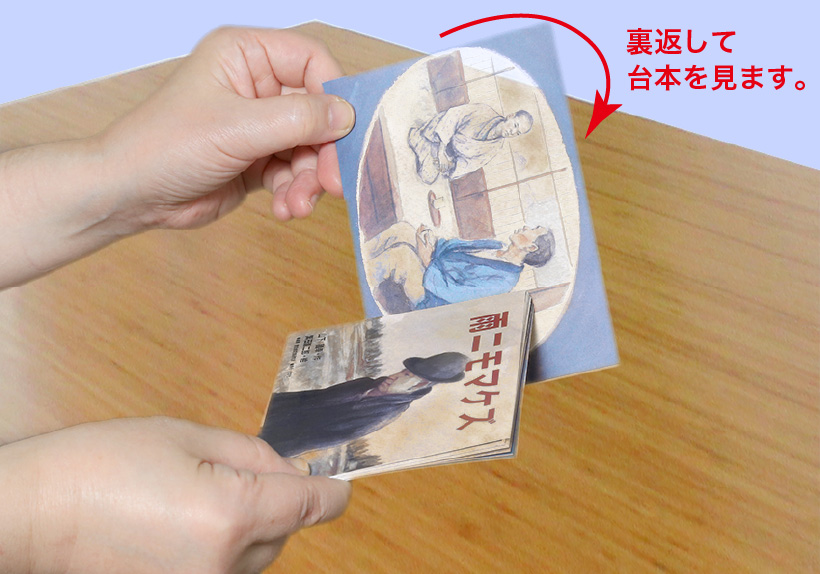 紙芝居は、描いてある絵と声で伝えますが、一応台本(セリフ)が存在します。その台本は基本的に絵の裏面に書いてあるものが一般的です。ところが一つの物語は複数枚の絵が重なっているので表題の絵の裏面には2枚目の台本が書かれています。つまり表題の台本は最後のページの裏側に書いてあります。