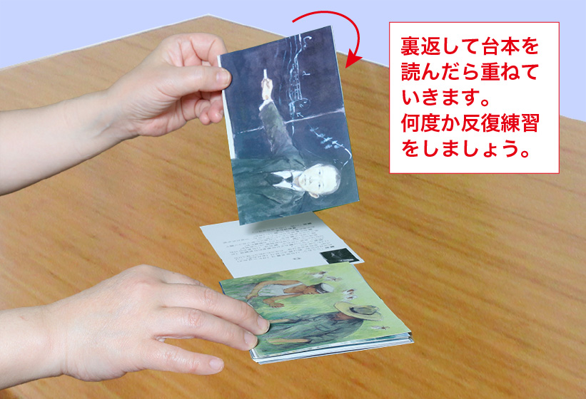 それでは楽しみながら練習しましょう。これで必ず、新たな紙芝居実演家誕生です!